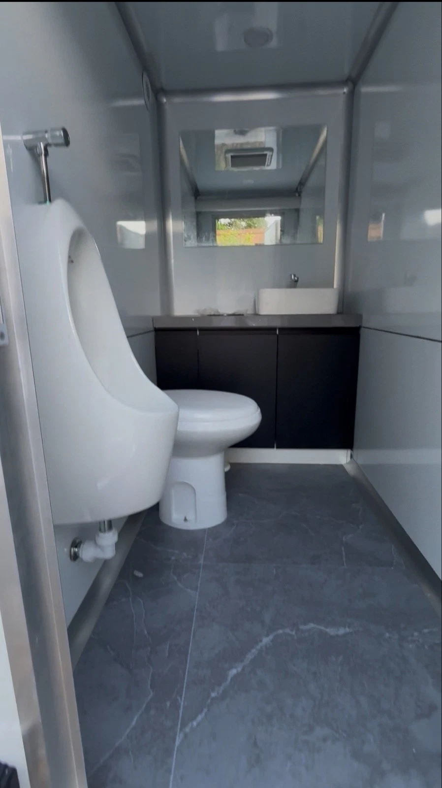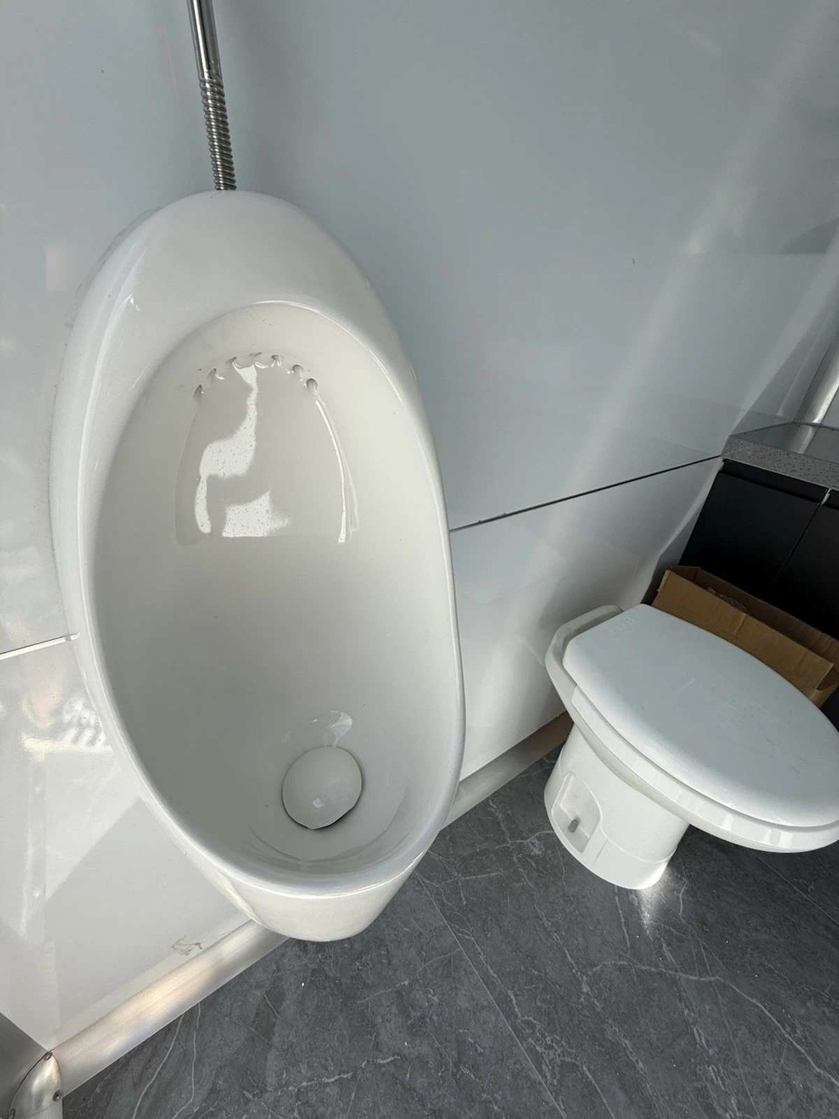 2 male-designated stalls include both a toilet and a urinal