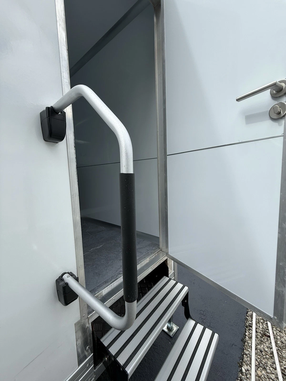 Foldable steps, handrails, restroom signage included